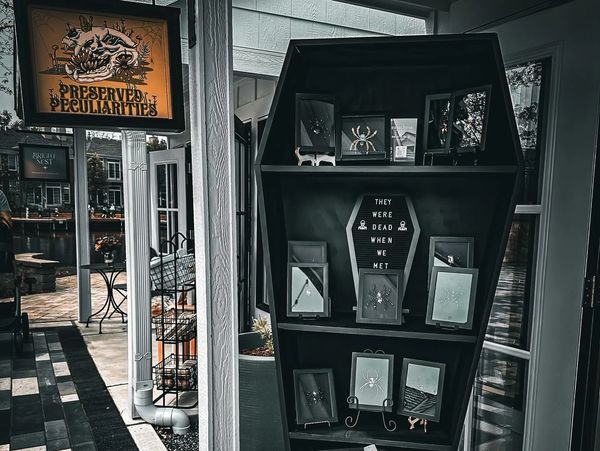 Offering art, oddities, oddity jewelry, taxidermy, and dried flower arrangements.